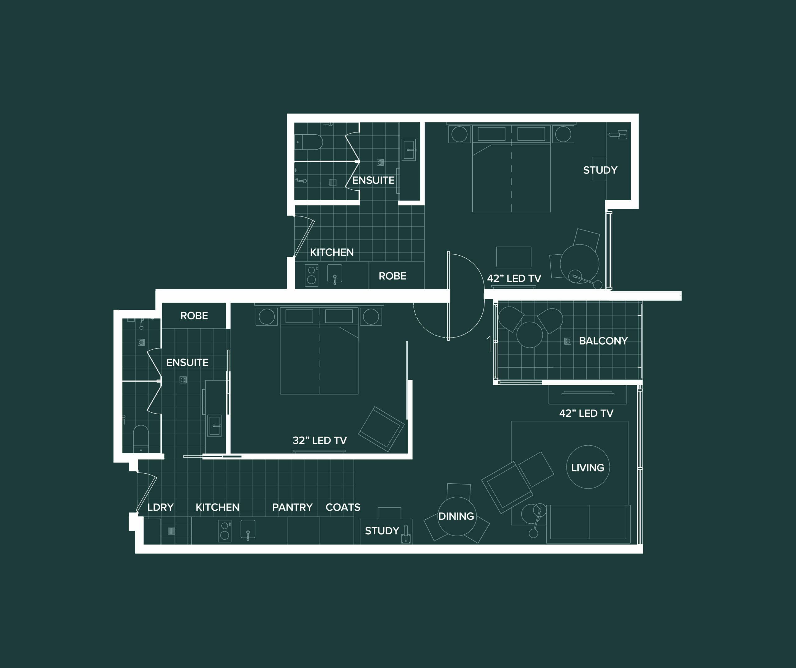 Comprising of an EAST Apartment interconnected with an EAST Studio, the EAST Two Bedroom Apartment is huge beyond compare. Offering privacy for two couples in king beds or room for the largest family, there are no pokey bedrooms here with over 90m2 of living area.